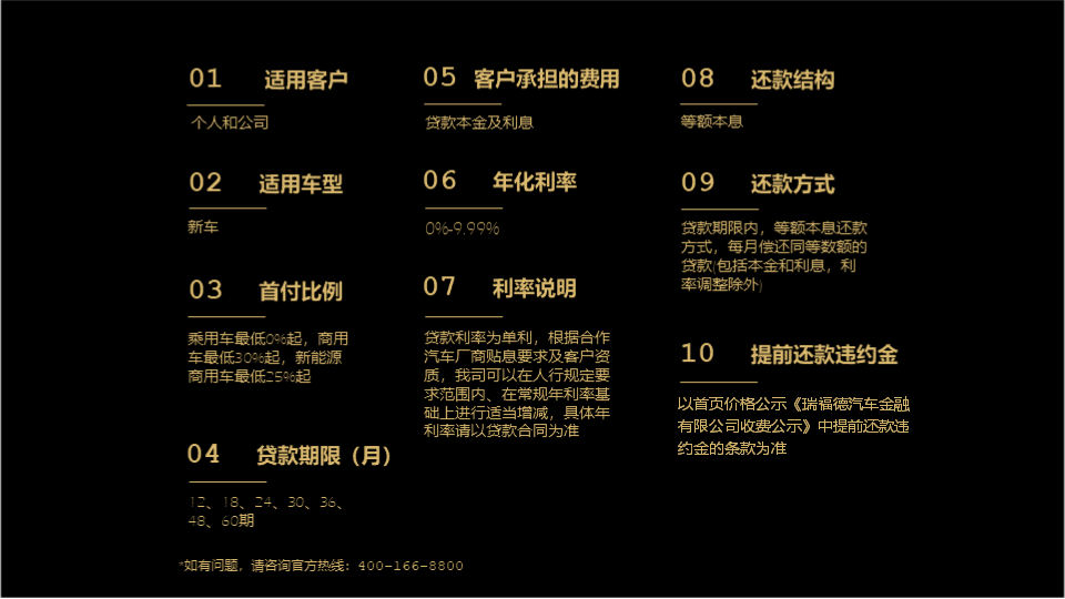 身份证+驾照可申请。新车融资期限为12、18、24、30、36、48、60期。首付乘用车最低0%起,商用车最低25%起,二手车融资期限为12、18、24、30、36、48、60期,首付最低30%(融资租赁业务20%)起。其中,贷款业务期限内,等额本息还款方式,每月偿还同等数额的贷款(包括本金和利息,利率调整除外);融资租赁业务期限内,每月支付同等数额的租金。