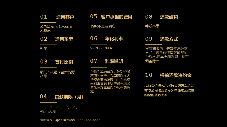 身份证+驾照可申请。新车融资期限为12、18、24、30、36、48、60期。首付乘用车最低0%起,商用车最低25%起,二手车融资期限为12、18、24、30、36、48、60期,首付最低30%(融资租赁业务20%)起。其中,贷款业务期限内,等额本息还款方式,每月偿还同等数额的贷款(包括本金和利息,利率调整除外);融资租赁业务期限内,每月支付同等数额的租金。