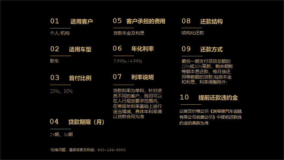 适用新车,贷款期限24、36期。首付比例20%或30%,最后一期支付项目总额的20%或30%尾款,剩余期数等额本息还款,每月偿还同等数额的贷款(包括本金和利息,利率调整除外)。