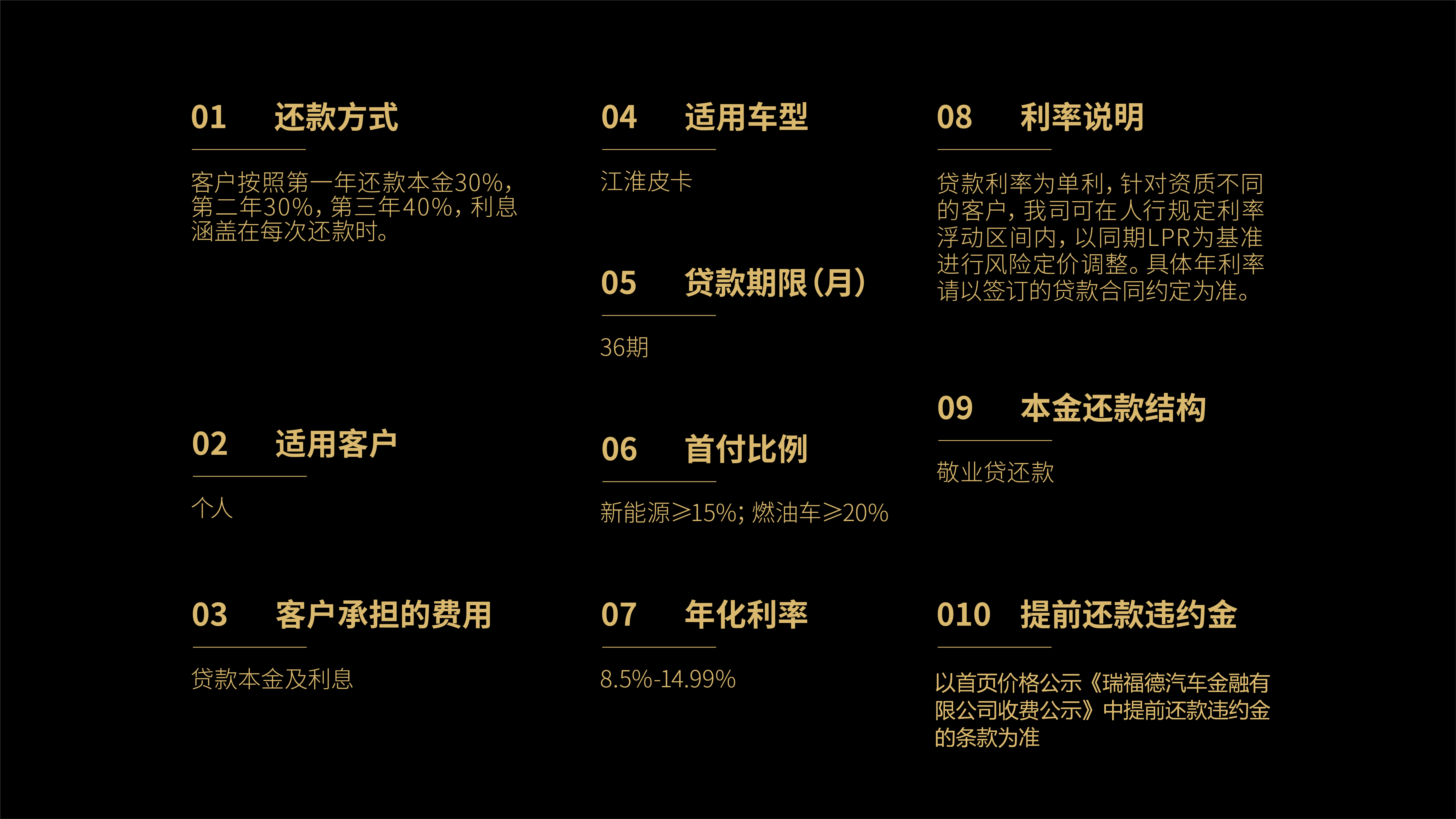 适用于江淮皮卡,贷款期限为:36期,首付比例:新能源≥15%;燃油车≥20%;客户按照第一年还款本金30%,第二年30%,第三年40%,利息涵盖在每次还款时
